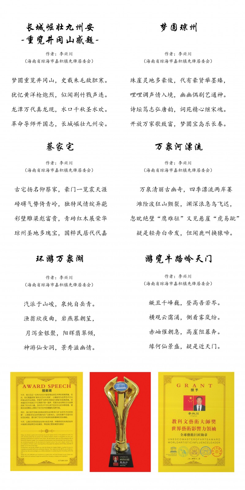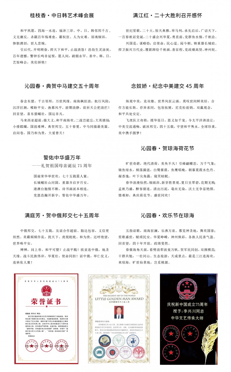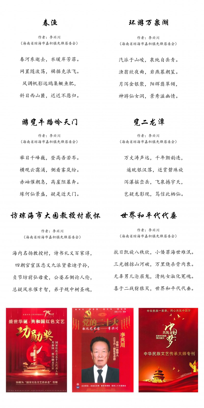 环球旅游卫视环球书画艺术馆启动仪式特邀艺术家:李兴川 李兴川,笔名彦之,汉族,1950年生,海南琼海市人。中华诗词学会会员,中国一级作家,琼海市诗词学会副会长《琼海湖》...“”