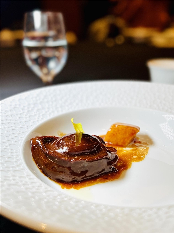 鲍之源鲜鲍的演绎由此过渡到核心产品——吉品干鲍。侯师傅深谙鲍之源吉品干鲍的软糯、溏心漂亮这两大特性。演绎干鲍,是中餐武林高手各自的独门秘笈,侯师傅以淮扬红烧技法为基底,墨鱼汁收汁干鲍,干鲍周身透亮,软糯醇厚。