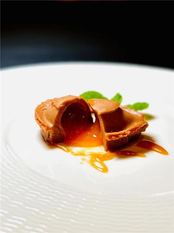 以鲍之源的吉品干鲍形状为巧思,以秋日甜柿子泥来表达干鲍的溏心,侯师傅在甜品上充分表达了妙思生于积累,出奇源于守正。宴席尾声,满堂喝彩。
