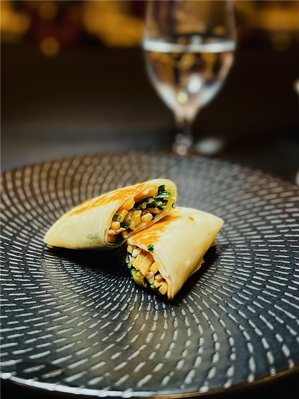 金陵什锦菜的灵感,加入鲍之源的鲜鲍切片,以卷饼呈现,层次分明。