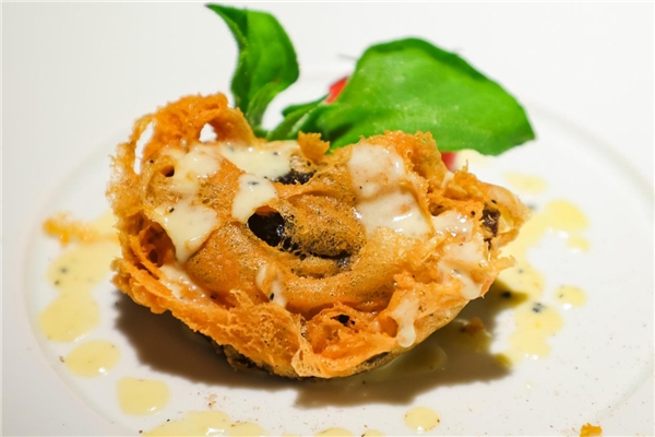 想象子福慧开在90年代,如果要制作这道菜,周主厨至少要提前一周准备干鲍的预制,为了得到透彻溏心,极佳卖相,还得托付懂行的粤菜师傅去挑选日本吉品干鲍。但是这次晚宴,他可能只需要发挥想象力,潜心研究菜的搭配与呈现,从脆皮牛肉中提取灵感,鲍鱼脆皮迸发双倍鲜香,改变干鲍千篇一律的呈现方式,把最繁琐、费时的部分交给鲍之源的预制品干鲍。