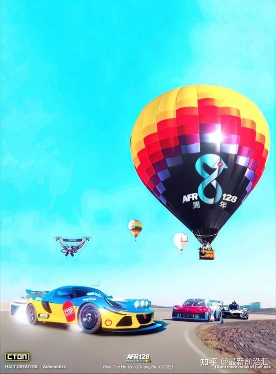 (结合线下矩阵式展览,电矩狂魔CTON汽车主题系列作品广泛运用于各类新型媒介,图为热门赛车游戏《极限竞速:地平线5》与小鹏汽车元宇宙游戏)